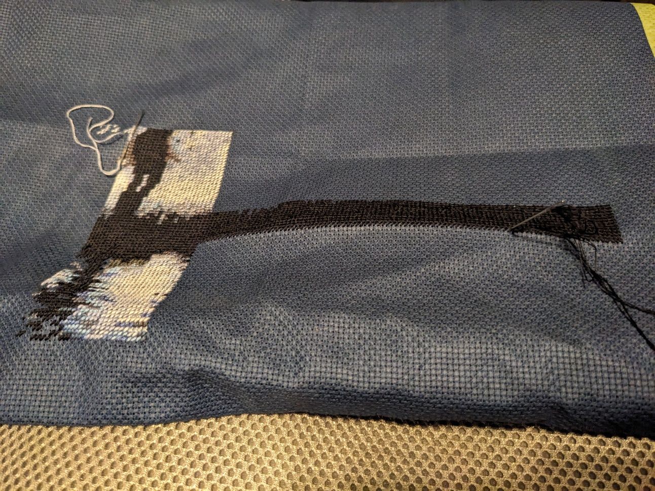 A personal project for the home that I work on while streaming TV, movies, or sports like the recent NHL Playoffs. It’s on navy blue Aida, so it has been hellish to work with. I also started out following the instructions, which has not played well with my math issues and working memory. I decided to go back to my old method of choosing one colour to focus on at a time. I’ve started doing that with black, which is hard, but it also outlines a lot of the picture and I think that will be helpful as I continue with it. I think I may need a silver pen or something to help me do the other black areas as an aid to overcome my challenges with counting.